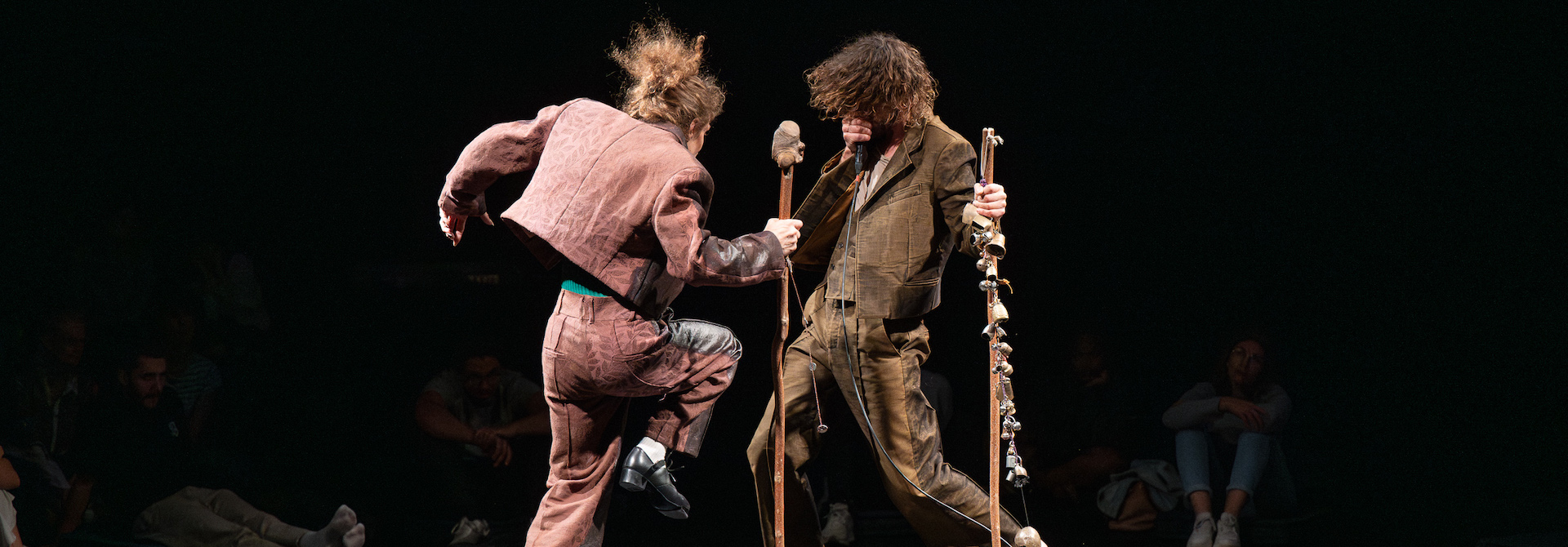 ” The scene is an arena. Two masked bodies, martial, unrecognizable, humble, and rattling. Microphones, loudspeakers, risers, bells, shoes. A ritual of presentations, a confrontation, a knot, a denouement. A total saturation of frequencies and muscles: a therapy through excess. Bodies and sounds torn between the melancholy of vanished rituals and the aggressiveness of actuality. Lips and heels in search of a forgotten code. A gracious and enduring duel of beatbox and percussions: a wall, a halo, an ancient world lost in the face of toxic perspiration, buried in the two fighters.”